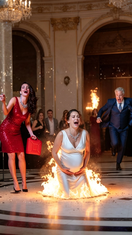 In the same heartbeat, her gown flashed bright—an ugly bloom of fire climbing fabric. The ballroom erupted into screams. Claire staggered, protecting her belly with both arms, her mind screaming run while her body fought panic. Someone shouted for water. Someone else shouted to call 911. But in the chaos, Claire’s eyes found Maxwell.