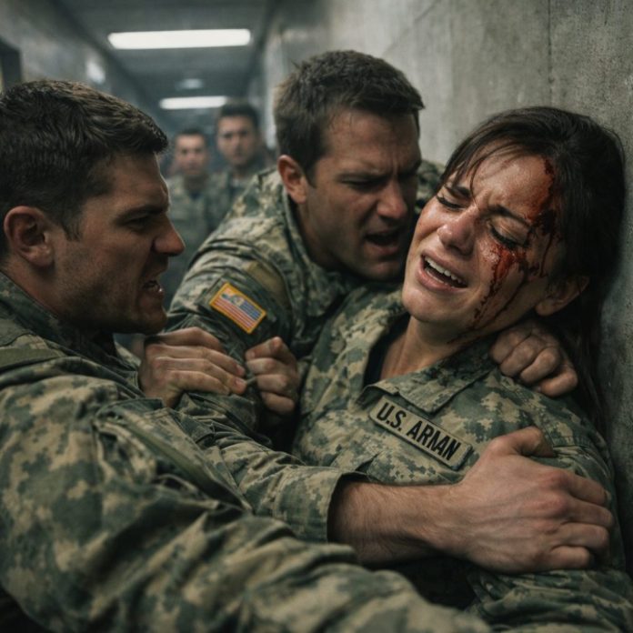 Sergeant Lyra Keaton stood at the center of it anyway, wrists cinched behind her back with industrial zip ties, shoulders pinned to a section of barbed-wire fence. Someone had dragged her there like a warning sign.